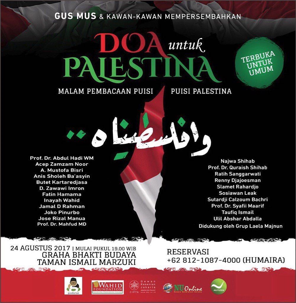 AISNUsantara.com- Gus Mus dan Kawan-kawan, Kamis (24/8/17) malam nanti, akan mengadakan doa bersama untuk palestina serta pembacaan puisi, guna keselamatan rakyat Palestina dari kezaliman zionis Israel, Graha bakti budaya, taman ismail marzuki Jakarta.