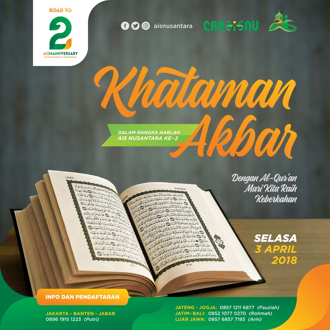Dalam rangka memperingati harlah yang kedua ini AISNusantara akan mengadakan KHATAMAN AKBAR via Online se-Nusantara lhoo..