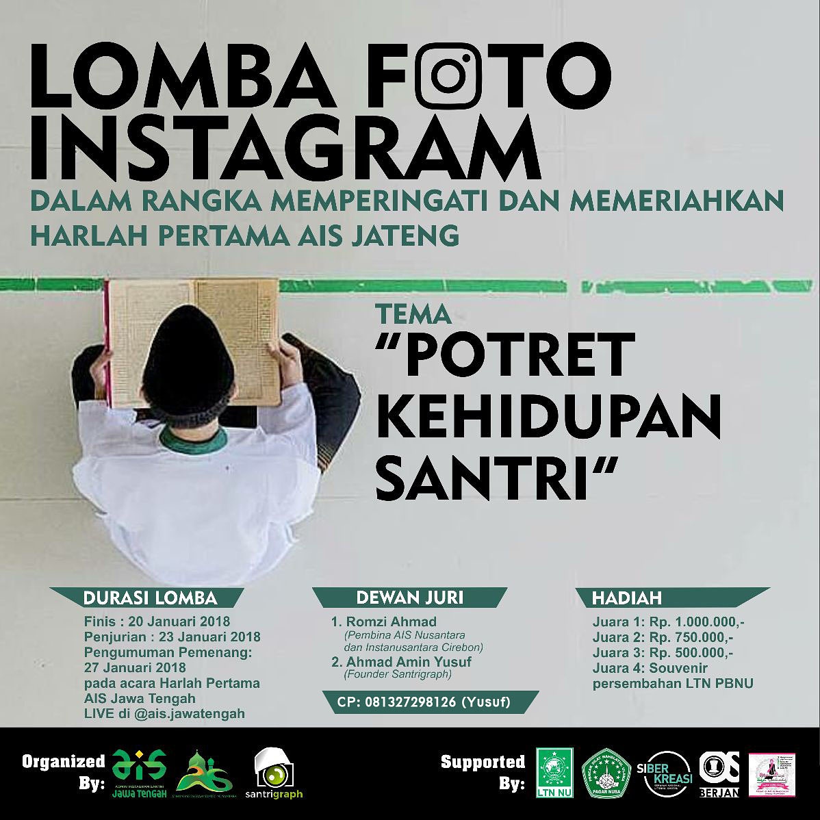 1. Upload photo kamu di IG. Wajib FOLLOW @ais.jawatengah dan @santrigraph menggunakan HASHTAG #aisjatenglombafoto pada foto yang dilombakan.